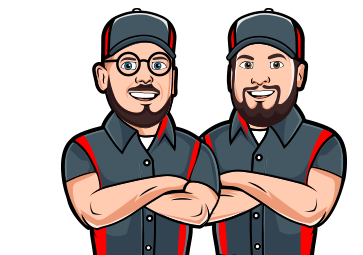 Two cartoon men with glasses and beards, wearing gray shirts with red accents, smiling.